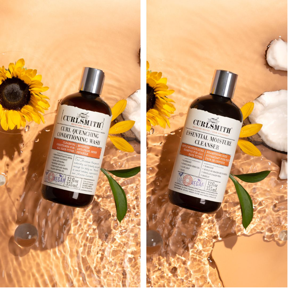 Curlsmith cleansing products on an orange background with sunflowers and coconuts