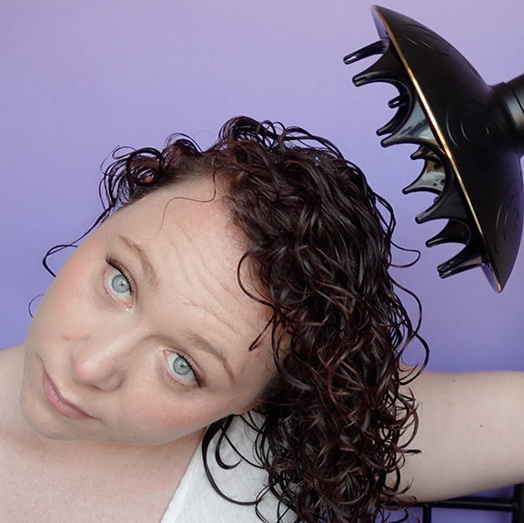 Hover the diffuser around your head, without touching the curls. Start close to the roots and then proceed towards the lengths until all is dry.